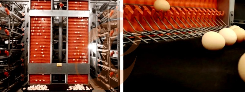 Eggs successively roll on egg belts, row ending egg collection machines, eggs are picked by workers.
